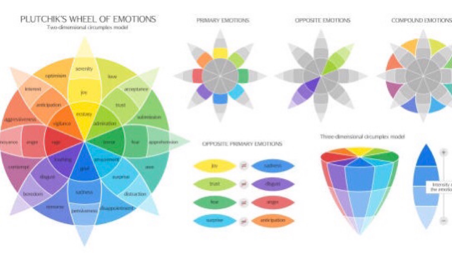 Given the complexity of emotions, Robert Plutchik created the Emotion Wheel to visualize the complexity of emotions and help people identify and label their emotions. The Emotion Wheel uses color to depict discrete emotions and blends of emotion, uses their gradients to express intensity, and uses the geometric shape to reflect polarity (or similarity) of emotions.