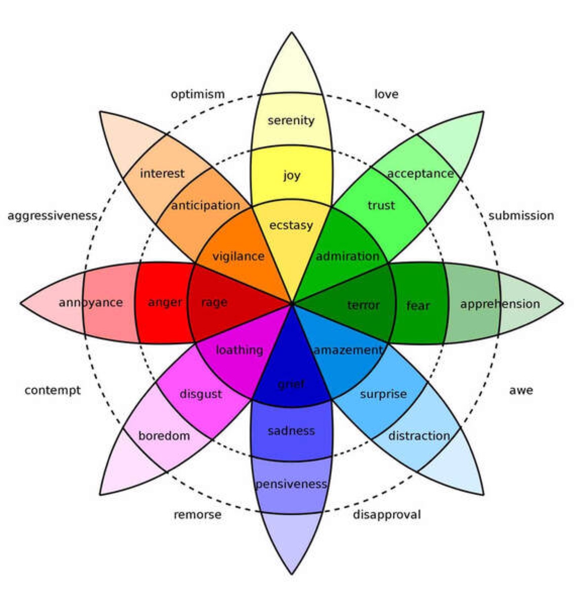 The center of the emotion wheel reflects the maximal levels of arousal of each emotion. The emotions further away from the center of the emotion wheel represent milder arousal levels of the primary emotions. Emotions placed closer to each other in the emotion wheel are deemed more similar than those farther apart. The words outside of the ‘slices’ in the emotion wheel are common blends of emotion (e.g., ‘surprise’ and ‘sadness’ combine to produce ‘disapproval’).