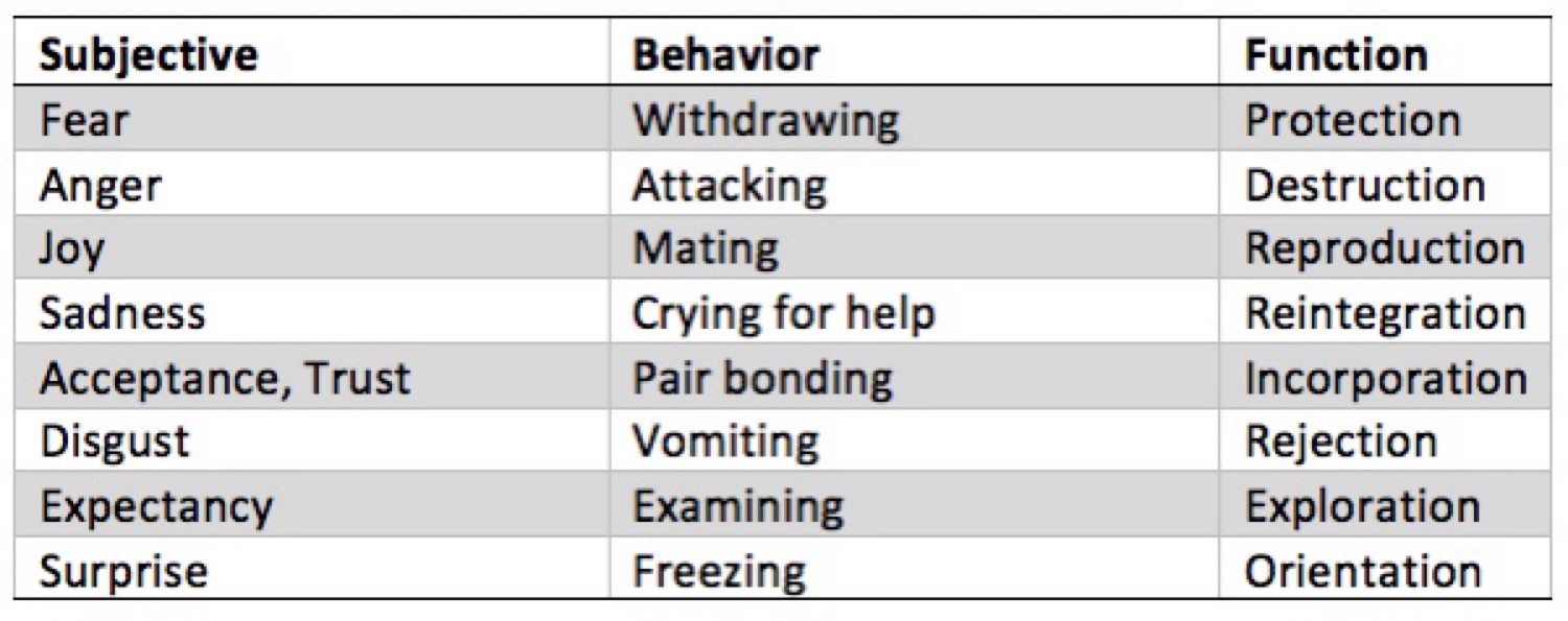 Plutchik argued that each emotion serves an evolutionary function and he identified specific survival behaviors as triggered by specific emotions.