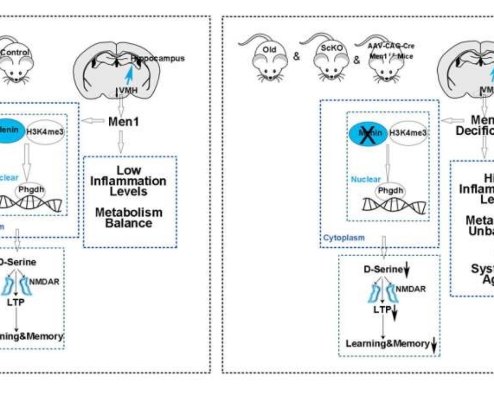 To test that, the authors delivered the gene for Menin into the hypothalamus of elderly (20-month-old) mice. 30 days later, they found improvements in skin thickness and bone mass, learning, cognition, and balance, which correlated with an increase in D-serine within the hippocampus.