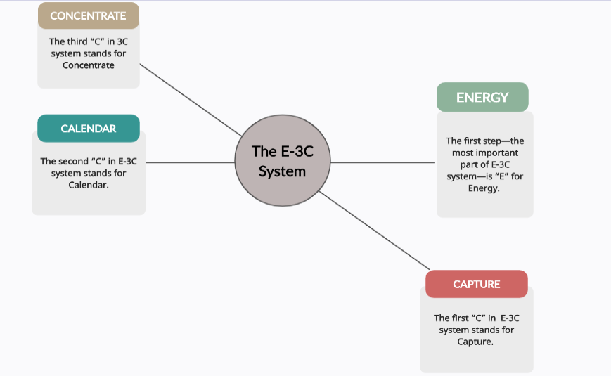 E-(Energy)=You can’t make more time, but you can increase your productivity, by getting enough sleep, eating healthy, and doing meditation