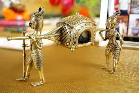 Dhokra (also spelt Dokra) is non–ferrous metal casting using the lost-wax casting technique. This sort of metal casting has been used in India for over 4,000 years and is still used. One of the earliest known lost wax artefacts is the dancing girl of Mohenjo-daro. The product of dhokra artisans are in great demand in domestic and foreign markets because of primitive simplicity, enchanting folk motifs and forceful form. Dhokra horses, elephants, peacocks, owls, religious images, measuring bowls, and lamp caskets etc., are highly appreciated
