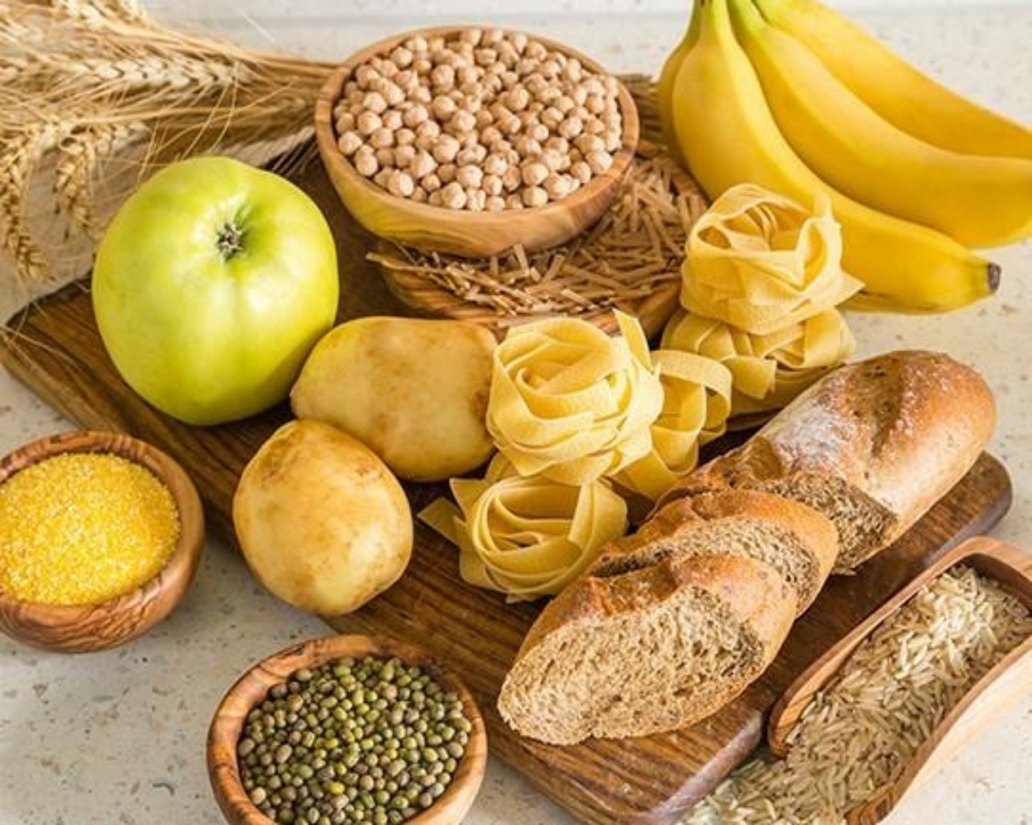 About half the calories in our diet should come from foods rich in carbohydrates, such as cereals, rice, pasta, potatoes, and bread. It is a good idea to include at least one of these at every meal.